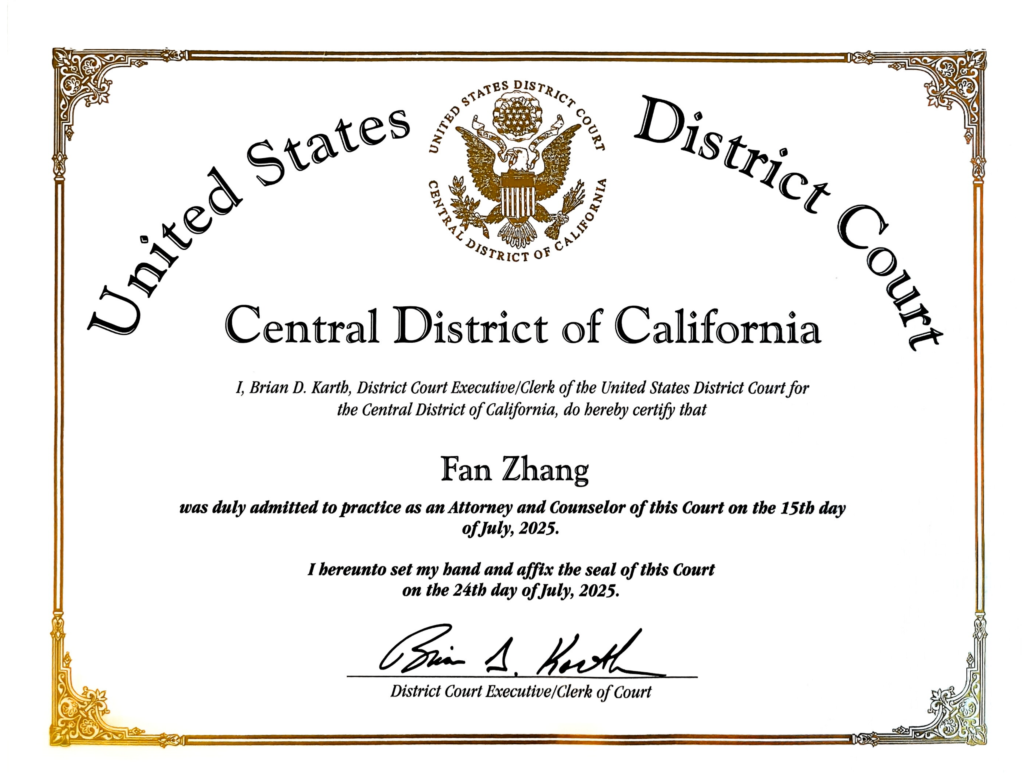 On July 15, 2025, lawyer Fan Zhang was formally admitted to practice before the U.S. District Court for the Central District of California (CDCA), qualifying her as a CDCA attorney authorized to appear in U.S. federal court.