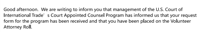 This appointment relates to the Court’s pro bono counsel program under 28 U.S.C. § 1581(d), which primarily covers judicial review of certain Trade Adjustment Assistance (TAA) determinations and other statutorily designated matters.