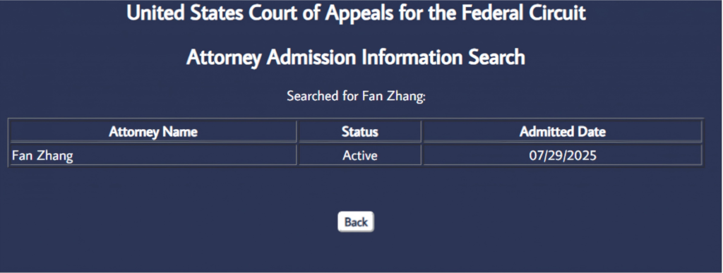 On July 29, 2025, lawyer Fan Zhang was formally admitted to practice before the U.S. Court of Appeals for the Federal Circuit (Federal Circuit / CAFC), qualifying her as a Federal Circuit attorney authorized to represent clients in specialized U.S. federal appellate proceedings.